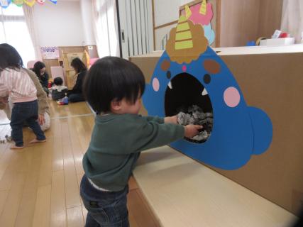 毛糸を巻き巻き…。あかちゃんの子鬼ちゃん